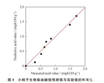 圖4為小桐子生物柴油的酸值實(shí)驗(yàn)值與對(duì)數(shù)模型預(yù)測(cè)值的函數(shù)關(guān)系: