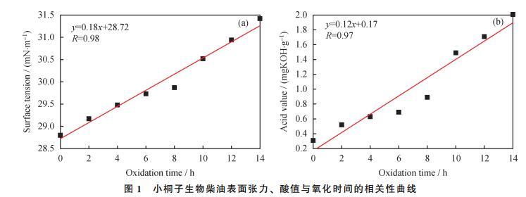 將氧化時(shí)間分別與小桐子生物柴油的表面張力、酸值進(jìn)行相關(guān)性分析,結(jié)果如圖1所示: