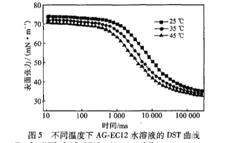 由圖5可知,當(dāng)溫度升高,DST下降的速率明顯加快。這是因為分子的不規(guī)則運動更加激烈,使得分子間的引力減小。表面張力越早開始下降,在各個階段的表面張力值就越低。在45℃下開始測量時,表面張力已經(jīng)降到了70mN/m左右,這也許是由于溫度升高降低了純?nèi)軇┧谋砻鎻埩?。升高溫度,表面張力下降的更快,更易達(dá)到第四個階段平衡狀態(tài)。這說明了高溫下其動態(tài)表面活性更好??赡苁怯捎诒砻婊罨茉诟邷貢r更低,使得AG.EC分子更易在溶液表面吸附。