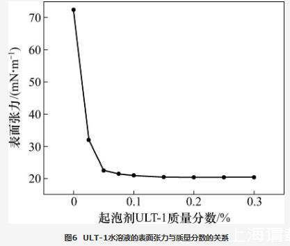 當(dāng)起泡條件相同時(shí),起泡劑水溶液的表面張力越低,發(fā)泡體積越高。配制一系列濃度梯度的起泡劑ULT-1水溶液,利用接觸角/表面張力測量儀采用懸滴法測量表面張力與起泡劑ULT-1質(zhì)量分?jǐn)?shù)的關(guān)系,結(jié)果如圖6所示。從圖6可知:當(dāng)起泡劑ULT-1質(zhì)量分?jǐn)?shù)小于0.05%時(shí),表面張力隨起泡劑ULT-1質(zhì)量分?jǐn)?shù)的提高快速降低;當(dāng)起泡劑ULT-1質(zhì)量分?jǐn)?shù)大于0.05%時(shí),表面張力降幅越來越?。划?dāng)起泡劑ULT-1質(zhì)量分?jǐn)?shù)提高至0.2%時(shí),表面張力降至20.40 mN/m,較蒸餾水降低了71.82%,繼續(xù)提高起泡劑ULT-1的質(zhì)量分?jǐn)?shù),表面張力不再降低。表明新型起泡劑ULT-1在較低濃度時(shí)即達(dá)到較低的表面張力,有利于提高發(fā)泡體積。