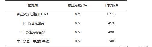 起泡性能主要是指起泡能力和泡沫穩(wěn)定性。發(fā)泡體積V0反映了起泡能力,析液半衰期t1/2反映了泡沫穩(wěn)定性。在室溫下,稱取一定質(zhì)量的起泡劑ULT-1于攪拌杯中,加入100 mL蒸餾水,置于攪拌器之上,以轉(zhuǎn)速11 000 r/min攪拌1 min。攪拌完畢后,立即取下攪拌杯,同時(shí)啟動(dòng)秒表,開始記錄消泡時(shí)間,將攪拌杯中的所有物質(zhì)全部倒入1 000 mL量筒中,讀取發(fā)泡體積和從泡沫中析出50 mL液體的時(shí)間,即為半衰期。通過改變起泡劑ULT-1的質(zhì)量測量起泡性能與起泡劑質(zhì)量分?jǐn)?shù)的關(guān)系,結(jié)果如圖7所示。從圖7可知:隨起泡劑ULT-1質(zhì)量分?jǐn)?shù)的提高,發(fā)泡體積增加幅度較大,半衰期緩慢增加。當(dāng)ULT-1質(zhì)量分?jǐn)?shù)升到0.2%時(shí),發(fā)泡體積達(dá)到501 mL,半衰期達(dá)到1 440 s,繼續(xù)提高質(zhì)量分?jǐn)?shù)發(fā)泡體積和半衰期基本不變,表明研制的新型起泡劑ULT-1低濃度時(shí)即具有較高的起泡性能,發(fā)泡體積高,泡沫半衰期長。同時(shí),對(duì)比評(píng)價(jià)了常用起泡劑的半衰期,結(jié)果如表1所示。從表1可知:質(zhì)量分?jǐn)?shù)為0.2%的起泡劑ULT-1與質(zhì)量分?jǐn)?shù)為0.5%的常規(guī)起泡劑相比,泡沫半衰期可提高3倍以上。