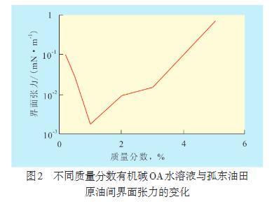 由水溶性好且不易揮發(fā)的有機堿OA水溶液在不同質量分數(shù)時與孤東油田原油之間界面張力的關系可以看出,當有機堿OA水溶液質量分數(shù)為0.1%~1.0%時,界面張力隨有機堿OA水溶液質量分數(shù)的增加迅速下降,當有機堿OA質量分數(shù)超過1.0%后,界面張力逐漸升高。表明有機堿OA水溶液與孤東油田原油作用可降低界面張力,且最佳的有機堿OA水溶液質量分數(shù)為1.0%。