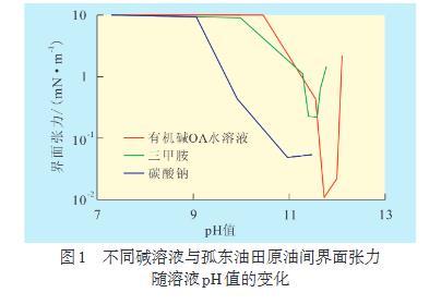 由不同pH值的碳酸鈉、三甲胺、有機堿OA水溶液與孤東油田原油之間界面張力的關系可見,無機堿和有機堿均可使孤東油田原油界面張力降低。當碳酸鈉溶液的pH值高于9時,其與原油的界面張力隨著pH值的升高而降低;當碳酸鈉溶液的pH值大于11時,其與原油的界面張力幾乎不再變化;當三甲胺和有機堿OA水溶液的pH值分別達到10和10.5后,其與原油的界面張力隨pH值升高先降低后升高,這是有機堿不同于無機堿的特點。