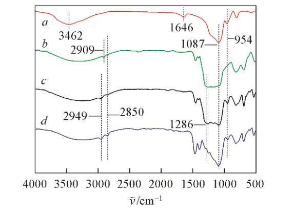 圖2為SiO?顆粒改性前后的紅外光譜圖。在裸露的SiO?顆粒(圖2譜線a)上,3459 cm?1處出現(xiàn)羥基的氫氧鍵伸縮振動(dòng)吸收峰,1646 cm?1處是納米SiO?表面吸附水的氫氧鍵振動(dòng)吸收峰,而在改性的顆粒上這2處吸收峰強(qiáng)度有所降低甚至消失,這是由于SiO?顆粒表面的硅羥基(Si—OH)與硅烷偶聯(lián)劑發(fā)生縮合反應(yīng)而數(shù)量減少,并且改變了顆粒表面與水之間氫鍵的鍵合密度;在圖2譜線b~d中,2949處和2850 cm?1處的吸收峰可分別歸屬為甲基和亞甲基上的碳?xì)滏I伸縮振動(dòng);并且這些吸收峰強(qiáng)度增加,說明甲基和亞甲基數(shù)量增加。在1170~1286 cm?1間的峰為—CF?、—CF?的伸縮振動(dòng)峰,由于—CF?、—CF?的伸縮振動(dòng)峰與1087~1200 cm?1間的硅氧鍵伸縮振動(dòng)吸收峰重合,從而導(dǎo)致圖2譜線b~d中1087~1286 cm?1間的吸收峰變寬,并且吸收峰強(qiáng)度依次減弱,說明—CF?、—CF?數(shù)量減少。綜上所述,可初步說明納米SiO?表面被不同比例的碳?xì)滏満头兼湼采w。