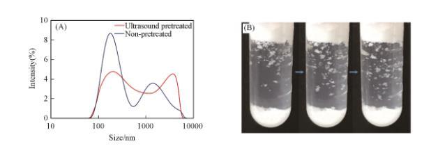 值得注意的是,如果粒子首先用超聲波分散在液體中,然后以相同的方式振蕩,則顆粒產(chǎn)生的泡沫高度有所下降[圖6(A)]。因此對(duì)比了振蕩和超聲波處理后的顆粒在液體中團(tuán)聚體的粒徑大小。采用動(dòng)態(tài)光散射儀間接表征了顆粒在液體中的團(tuán)聚情況[圖7(A)]??梢钥闯觯袷幒蟮囊后w中有較多物質(zhì)的粒徑大于單個(gè)顆粒直徑,而且粒徑分布很寬。這證明液體中存在明顯的顆粒團(tuán)聚體。由于顆粒本身存在巨大的表面能,多數(shù)顆粒在空氣中已經(jīng)自發(fā)團(tuán)聚。顆粒在液體中大多也以團(tuán)聚體的方式存在。少量空氣被密封在浸沒(méi)于油相中的顆粒團(tuán)聚體內(nèi)部,這部分不與外界聯(lián)通的空氣提供了額外的壓力,進(jìn)而阻止了進(jìn)一步滲透。這種顆粒團(tuán)聚體表面同樣形成了由Cassie-Baxter方程描述的復(fù)合表面,該復(fù)合表面的形成保護(hù)了構(gòu)成團(tuán)聚體的顆粒不被完全潤(rùn)濕,并使團(tuán)聚體表面具有合理的疏油性(cosθ_CB的值接近0),從而在熱力學(xué)上團(tuán)聚體便于發(fā)生吸附。而溶液經(jīng)超聲波處理后顆粒被潤(rùn)濕,團(tuán)聚體被破壞使尺寸變小,并且均勻分布在溶液中。圖6(B)顯示了在經(jīng)超聲波處理后的表面張力測(cè)試數(shù)據(jù),同樣表明團(tuán)聚體被破壞后,被潤(rùn)濕的顆粒不再傾向于吸附在表面上。