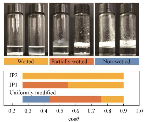 放置在靜止液體表面的顆粒的潤(rùn)濕行為由圖5示出。隨著液體表面張力的增加,從光滑的氟碳鏈覆蓋的表面獲得的cosθ值同時(shí)增大,液體頂部的表面出現(xiàn)明顯的不溶顆粒。這種顆粒不潤(rùn)濕的情況與顆粒形成粗糙表面測(cè)量的結(jié)果具有相關(guān)性。干燥的顆粒以蓬松狀態(tài)直接向油相傾倒,如果在油相表面能形成足夠強(qiáng)壯的、由顆粒組成的亞穩(wěn)態(tài)Cassie-Baxter狀態(tài),那么疏油表面將會(huì)形成,并阻止其它顆粒接觸油相,宏觀表現(xiàn)為顆粒不潤(rùn)濕。相反,如果油相表面由顆粒組成的亞穩(wěn)態(tài)Cassie-Baxter狀態(tài)魯棒性不足,在手動(dòng)振蕩或重力作用下,顆?;蝾w粒團(tuán)聚體接觸油相并浸沒(méi)在油相中。亞穩(wěn)態(tài)魯棒性與顆粒表面材料潤(rùn)濕角密切相關(guān),即不同類(lèi)型的顆粒具有明顯不同的潤(rùn)濕轉(zhuǎn)折點(diǎn)。JP1潤(rùn)濕性轉(zhuǎn)折點(diǎn)位于均勻修飾顆粒右側(cè),JP2沒(méi)有發(fā)現(xiàn)潤(rùn)濕轉(zhuǎn)折點(diǎn)。這與顆粒上接枝的烷烴鏈數(shù)量有關(guān)。JP2上盡管存在氟碳鏈,但由于烷烴鏈覆蓋的面積太大,使顆粒整體表現(xiàn)出強(qiáng)烈的親油性。