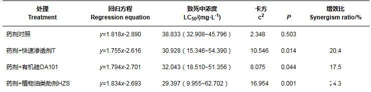 表3 3種助劑添加后螺蟲乙酯防治石斛菲盾蚧室內(nèi)毒力變化