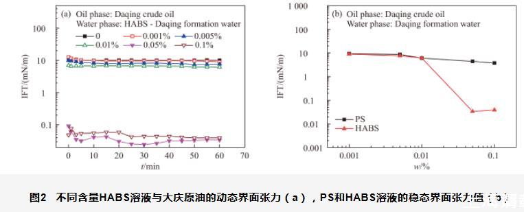 圖2不同含量HABS溶液與大慶原油的動態(tài)界面張力(a),PS和HABS溶液的穩(wěn)態(tài)界面張力值(b)
