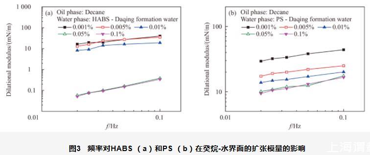 圖3頻率對HABS(a)和PS(b)在癸烷-水界面的擴(kuò)張模量的影響
