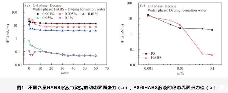 圖1不同含量HABS溶液與癸烷的動態(tài)界面張力(a),PS和HABS溶液的穩(wěn)態(tài)界面張力值(b)
