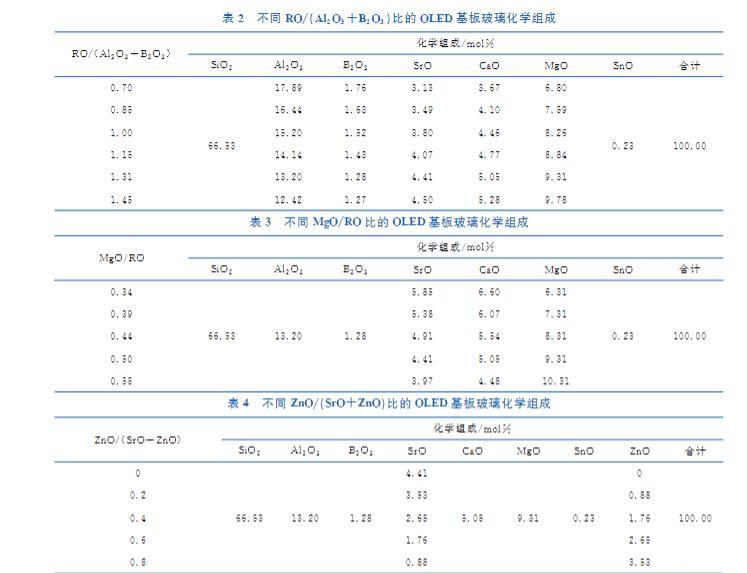 根據(jù)開發(fā)需求,本文設(shè)計(jì)了四組不同化學(xué)組成的OLED基板玻璃。如表1~表4所示,分別通過改變組成中的Al?O?/SiO?、RO/(Al?O?+B?O?)、MgO/RO和ZnO/(SrO+ZnO),研究表面惰性組分和表面活性組分的相對(duì)含量,以及同堿土金屬氧化物網(wǎng)絡(luò)作用相似但活性更強(qiáng)的過渡金屬氧化物對(duì)無堿鋁硅酸鹽玻璃表面張力的影響。