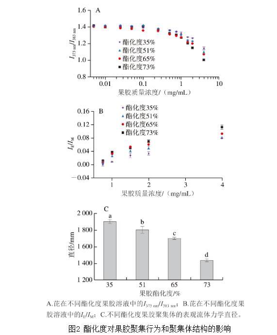 如圖2B所示,芘在高酯化度果膠溶液中表現(xiàn)出更高的IE/IM。這可能是因?yàn)楦啧セ裙z形成的聚集體內(nèi)部具有更多且極性更低的疏水微區(qū),促進(jìn)了芘分子在疏水微區(qū)中的溶解和分布,進(jìn)而增加了芘二聚體的形成,最終導(dǎo)致IE/IM升高。這一結(jié)果進(jìn)一步驗(yàn)證了高酯化度果膠形成的聚集體更疏水的結(jié)論。