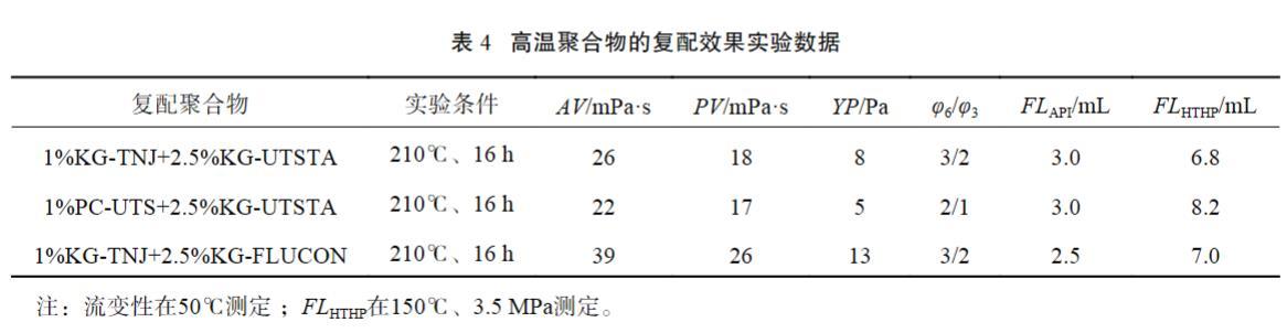 室內(nèi)以濾失改善效果較好的1%DrilFILHT為基礎(chǔ),考察增黏劑KG-TNJ、PC-UTS與2種抗超高溫改性淀粉的復(fù)配效果,選定材料最佳組合。評(píng)價(jià)配方:基礎(chǔ)配方+1.0%DrilFILHT+復(fù)配聚合物,實(shí)驗(yàn)結(jié)果見表4。
