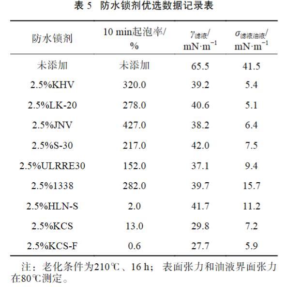 表5防水鎖劑優(yōu)選數(shù)據(jù)記錄表