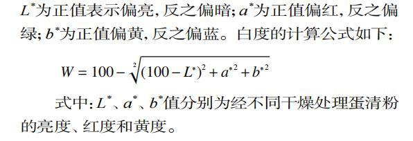 式中:L*、a*、b*值分別為經(jīng)不同干燥處理蛋清粉的亮度、紅度和黃度。