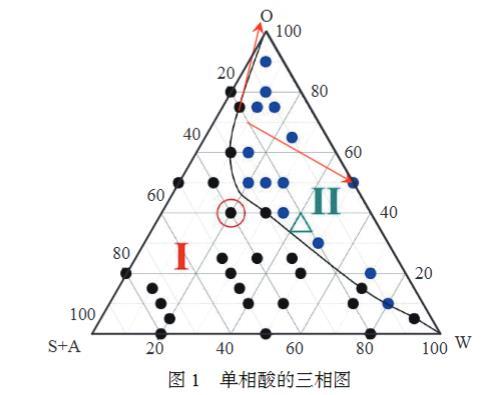 通過擬三元相圖制備單相酸相圖,根據油相(O)、酸相(W)、表面活性劑(S)+助表面活性劑(A)的比例進行三相圖的繪制。室溫下,固定油相(O)的加量,固定非離子表面活性劑(S1)與陽離子表面活性劑(S2)的質量比,固定表面活性劑(S,S=S1+S2)與助表面活性劑(A)的質量比。將不同比例下的液體進行離心,然后進行觀測,觀察體系由澄清透明(一相)變?yōu)榛鞚幔ǘ啵┑南嘧冞^程,在每次發(fā)生相變的同時記錄所滴加鹽酸的量,以O、S+A、W為三相,繪制擬三元相圖,見圖1。由圖1可知,在圖1的紅圈標記區(qū)域,配方的經濟性最好,是維持單相區(qū)域最小的表面活性劑用量(S+A),且該配方下的單相酸遇水遇油后仍可在較大范圍內保持單相。
