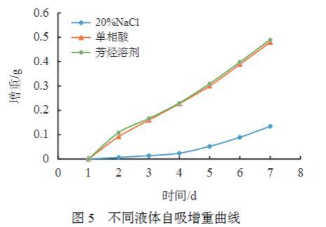 設置不同液體進行自吸實驗,對比親油巖心對于不同液體的自吸能力,實驗結果見圖5。對孔隙介質而言,潤濕性控制兩相或多相流體的分布和流動。平衡時濕潤相與孔隙表面相互接觸,而非濕相占據孔隙的中央位置,介質中發(fā)生兩相或多相流動時,毛管力與濕相流動方向一致,是非濕相自發(fā)進入巖心介質驅替潤濕相的阻力,對于油濕巖心介質,很難發(fā)生水的自吸。從實驗結果可以看出,單相酸自吸效果和芳烴溶劑十分接近。