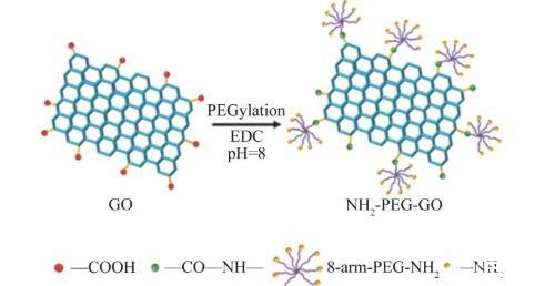 NH2-PEG-GO的制備方法:使用8-arm-PEG-NH2對GO表面進行修飾(圖1)。取80 mL上述細胞破碎機處理后的GO溶液,加入16 mL質(zhì)量濃度為2 mg/mL EDC來活化GO表面羧基,然后將混合溶液在功率為570 W條件下超聲30 min(開1.5 s,關(guān)1 s),待分散均勻后,再用5%NaOH溶液來調(diào)節(jié)溶液酸堿性(pH=8),隨后將240 mg 8-arm-PEG-NH2加入,超聲反應(yīng)30 min后,再常溫攪拌反應(yīng)12 h,離心水洗后得到氨基修飾的GO,于室溫真空冷凍干燥2 d后,得到最終產(chǎn)物,將產(chǎn)物研磨備用。