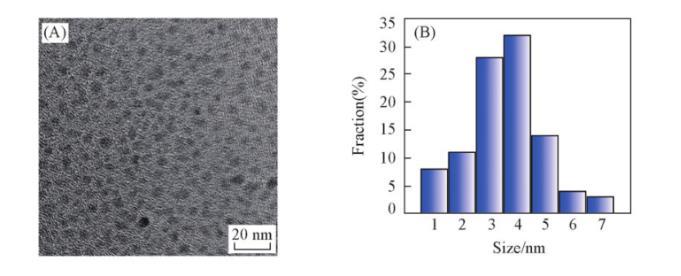 通過傅里葉變換紅外光譜(FTIR)、透射電子顯微鏡(TEM)和X射線衍射(XRD)對DA-GQD的結(jié)構(gòu)進(jìn)行表征。從FTIR譜圖(圖S1,見本文支持信息)可知,DA-GQD可能包含C—H,O—H,O═C(R)—和C—N基團(tuán)。從TEM和粒徑分布圖(圖2)可以看出,DA-GQD顆粒比較均勻,基本上為橢球形納米顆粒,粒徑主要分布在1~7 nm,平均粒徑約為3.5 nm。XRD譜圖(圖S2,見本文支持信息)中在20°左右有一個較寬的峰,說明合成的DA-GQD具有石墨烯結(jié)構(gòu)。