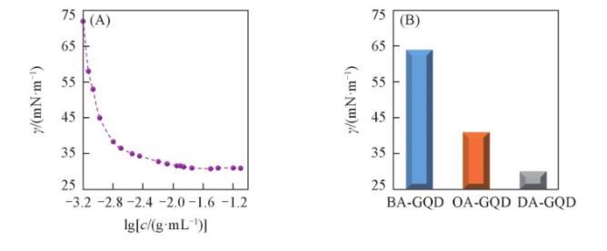 為了研究烷基鏈中碳原子數(shù)對表面活性的影響,按照1.2.1節(jié)方法,用丁胺和辛胺代替十二胺,分別制備了丁胺功能化石墨烯量子點(diǎn)(BA-GQD)和辛胺功能化石墨烯量子點(diǎn)(OA-GQD),并測定其最低表面張力。由圖3(B)可知,DA-GQD的表面張力比BA-GQD和OA-GQD的表面張力低得多,表現(xiàn)出更好的表面活性。3種石墨烯量子點(diǎn)的主要區(qū)別在于烷基胺的碳鏈長度,結(jié)果表明,烷基碳鏈長度對石墨烯量子點(diǎn)的表面活性有較大影響,烷基鏈越長,表面活性越好。上述規(guī)律與經(jīng)典的表面化學(xué)理論一致。