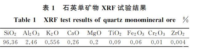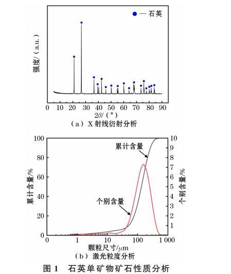 本試驗所用的單礦物石英取自某礦廠,將制備后的石英單礦物樣品進行X射線衍射(XRD)分析、X射線熒光光譜(XRF)分析和激光粒度分析,XRD的分析結(jié)果如圖1(a)所示,XRF的分析結(jié)果見表1,粒度分析如圖1(b)所示。從圖1(a)可以看出,石英單礦物SiO?峰強度以及密度最高,說明SiO?占主導地位。從圖1(b)可以看出,樣品的中值粒徑D??達到了133.5μm,D??則達到了264.3μm.綜合上述礦物的純度以及粒度,石英可滿足后續(xù)單礦物試驗以及機理分析的要求。