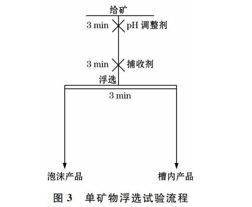 采用一次粗選的試驗流程,探究十二胺(DDA)和YTDB在不同礦漿pH、不同捕收劑用量下,對石英以及赤鐵礦回收率的影響。單礦物浮選試驗在XFD-Ⅲ浮選機進行,在室溫條件下配制礦漿,稱取2.00 g的單礦物放入浮選槽中,再加入20 g去離子水,控制浮選機的攪拌速度為1900 r/min,攪拌2 min以充分攪勻礦漿。加入事先準備好的pH調(diào)整劑調(diào)漿3 min,再加入捕收劑調(diào)漿3 min后,開始刮泡,控制刮泡時間為3 min.浮選結(jié)束后,將精礦進行過濾、烘干、稱重,隨后計算其回收率。單礦物浮選試驗流程如圖3所示。