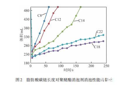 圖2脂肪酸碳鏈長度對聚醚酯消泡劑消泡性能的影響