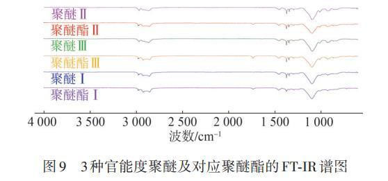 圖9為3種官能度的聚醚和聚醚酯FT-IR譜圖。由圖9可以看出,在3種官能度聚醚的FT-IR譜圖中,1 737 cm?1處均無特征峰,而3種官能度聚醚酯在1 737 cm?1處均有特征峰,為酯基C==O的吸收峰,說明3種官能度聚醚末端的醇羥基已經(jīng)與脂肪酸發(fā)生反應(yīng)。2 971 cm?1處的特征峰表明有—CH?存在,2 857和1 455 cm?1處的特征峰表明存在—CH?—,1 296 cm?1處的特征峰則為—CH?的彎曲振動(dòng)峰,在1 097 cm?1處的C—O—C伸縮振動(dòng)峰較明顯,表明聚醚酯中醚鍵較多。