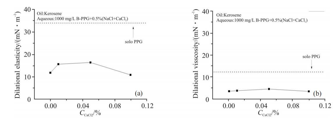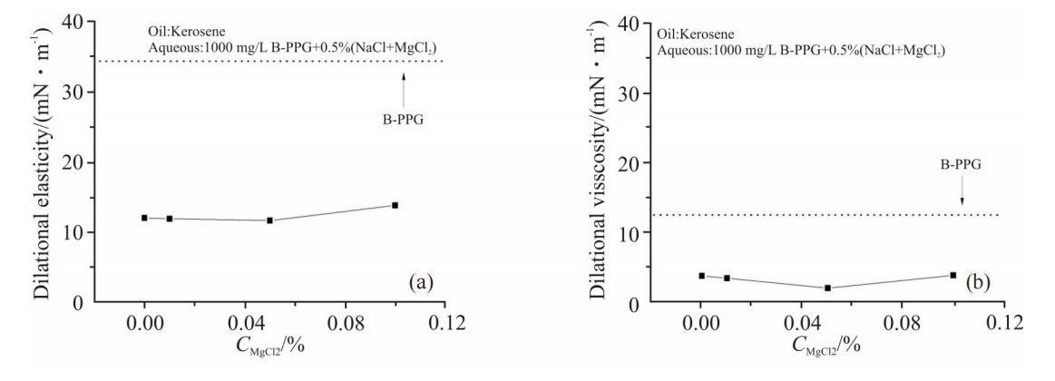 Ca2+濃度對(duì)1000mg/LB-PPG溶液界面擴(kuò)張參數(shù)的影響見(jiàn)Fig.7。從圖中可以看出,電解質(zhì)中Ca2+含量增大對(duì)界面擴(kuò)張黏性的影響較小;而擴(kuò)張彈性則在低Ca2+濃度條件下略有變化,從12mN/m增大到17mN/m。二價(jià)陽(yáng)離子能夠與2個(gè)負(fù)電荷發(fā)生靜電吸引作用,因此,可作為“橋梁”,與不同B-PPG分子中的負(fù)電荷發(fā)生作用,增加聚集體結(jié)構(gòu)的強(qiáng)度。Ca2+比Mg2+半徑大,與不同B-PPG分子發(fā)生作用的幾率也大,增大擴(kuò)張彈性的幅度較大。