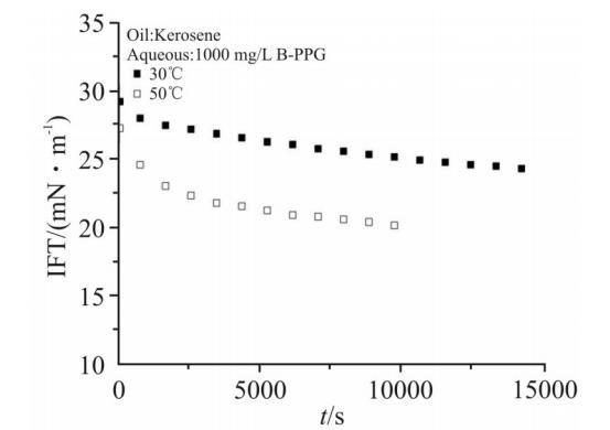 在油田開(kāi)采過(guò)程中,油藏溫度是必須考慮的要素之一。對(duì)于分子結(jié)構(gòu)中含聚氧乙烯基團(tuán)(EO)的表面活性劑,溫度升高會(huì)破壞EO與水分子形成的氫鍵,增大表面活性劑的油溶性,對(duì)界面張力的影響較大。而對(duì)于離子型表面活性劑,溫度對(duì)界面張力的影響較小。Fig.8示出了1000mg/L B-PPG溶液在30℃和50℃時(shí)的動(dòng)態(tài)界面張力。由圖可見(jiàn),在50℃時(shí),體系的界面張力比30℃時(shí)降低了5mN/m左右。B-PPG的水溶性很大程度來(lái)源于酰胺基團(tuán)與水分子形成的氫鍵,因此,溫度升高,B-PPG的油溶性增大,界面吸附量有所增加,界面張力明顯降低。