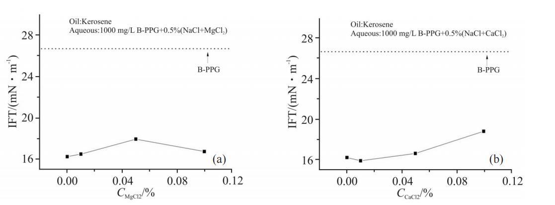 油藏地層水中含有Ca2+,Mg2+等二價(jià)陽(yáng)離子,作為反離子可與B-PPG吸附膜發(fā)生作用,可能有其獨(dú)特的行為。固定水相總礦化度為0.5%,改變其中二價(jià)陽(yáng)離子的含量,考察了Ca2+和Mg2+對(duì)B-PPG界面膜性質(zhì)的影響。Fig.5所示為二價(jià)陽(yáng)離子濃度對(duì)1000mg/LB-PPG溶液界面張力的影響。從圖中可以看出,隨著電解質(zhì)中二價(jià)陽(yáng)離子濃度增大,界面張力均略有升高,其中Ca2+的影響程度略高于Mg2+。從陽(yáng)離子半徑考慮,Ca2+>Mg2+>Na+,因此,用二價(jià)陽(yáng)離子部分頂替一價(jià)陽(yáng)離子,可能造成界面分子排列的緊密程度有所降低,界面張力略有升高。Ca2+的半徑更大,界面張力的升高趨勢(shì)更明顯。