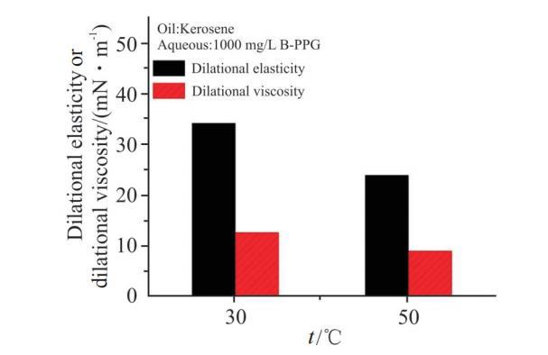 溫度對(duì)1000 mg/L B-PPG溶液界面擴(kuò)張彈性和黏性的影響見(jiàn)Fig.9。實(shí)驗(yàn)結(jié)果表明,當(dāng)溫度從30℃升高到50℃時(shí),界面擴(kuò)張彈性和黏性均明顯降低。隨著溫度升高,界面膜變得疏松,同時(shí),B-PPG分子的熱運(yùn)動(dòng)加劇,擴(kuò)散交換過(guò)程變快,上述變化均會(huì)造成界面膜強(qiáng)度的降低,50℃時(shí)B-PPG界面膜的彈性和黏性不到30℃的1/2。