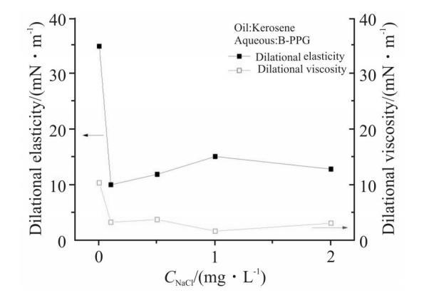 Fig.4為NaCl濃度對(duì)1000mg/L的B-PPG溶液界面擴(kuò)張參數(shù)的影響。由圖可知,加入NaCl后,體系的界面擴(kuò)張彈性和擴(kuò)張黏性都明顯下降,擴(kuò)張彈性降低超過(guò)了20mN/m,擴(kuò)張黏性也由10mN/m左右下降到了5mN/m左右。