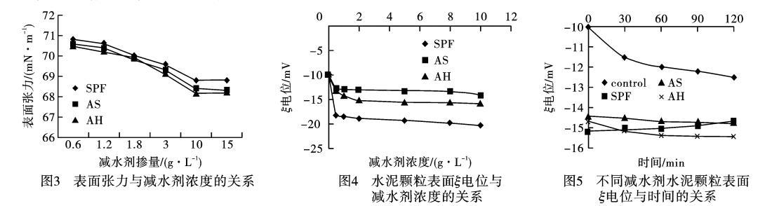 1)SPF對水泥顆粒表面電位的影響ξ電位表示水泥顆粒間靜電排斥力的大小。ξ電位越大水泥顆粒間的靜電斥力越大,減水劑分散作用越強(qiáng)。摻加不同濃度SPF、AS和AH的水泥懸浮體系的ξ電位,如圖4所示。