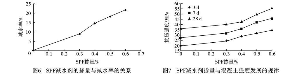 c.SPF高效減水劑應(yīng)用性能研究表明,隨著摻量的增大,減水率有成比例增加的趨勢,低摻量下即具有較強(qiáng)的減水分散效果,繼續(xù)增加摻量后減水率處于平緩狀態(tài)。摻加SPF高效減水劑對混凝土有明顯的增強(qiáng)作用,隨著減水劑摻量的增加,不同齡期的抗壓強(qiáng)度都在增加,同時(shí)混凝土早期強(qiáng)度發(fā)展很快,3d的強(qiáng)度可達(dá)到28d強(qiáng)度的60%—70%,7d強(qiáng)度可達(dá)到28d強(qiáng)度的80%—90%,混凝土后期強(qiáng)度也有增長的趨勢。