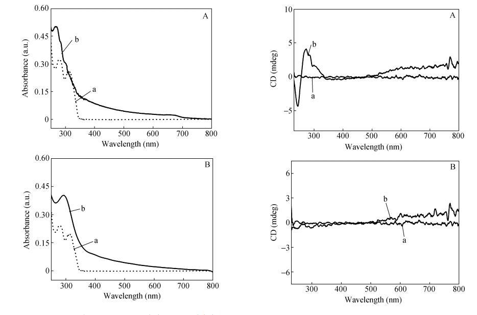 這個(gè)位置對(duì)應(yīng)于香豆素基團(tuán)的吸收帶,因此歸屬于香豆素基團(tuán)的CD信號(hào)。在CODA單體LB膜中,香豆素基團(tuán)間形成了緊密的H-聚集,而且由于相鄰兩個(gè)芳香環(huán)受到π-π體系間靜電斥力的影響以"面對(duì)面"重疊排列的可能性很小,通常存在錯(cuò)位。在單分子膜壓縮過(guò)程中,香豆素基團(tuán)間強(qiáng)烈的π-π堆積形成螺旋排列,并且由于過(guò)度擠壓,體系鏡面對(duì)稱(chēng)性被打破,某一方向的螺旋堆砌結(jié)構(gòu)在LB膜中占主導(dǎo)地位,從而產(chǎn)生超分子手性。需要指出的是,CODA單體LB膜手性信號(hào)強(qiáng)度和方向與沉積過(guò)程密切相關(guān),即不同批次制備出的LB膜手性信號(hào)強(qiáng)度大小不一甚至是方向相反。換句話(huà)說(shuō)CODA單體LB膜形成的螺旋結(jié)構(gòu)方向是隨機(jī)的。但是對(duì)于CO2DA單體LB膜,分子排列較松散,存在局部的缺陷,香豆素基團(tuán)間無(wú)法形成緊密有序的規(guī)整排列,沒(méi)有觀(guān)察到明顯的CD信號(hào)(圖5(B))。