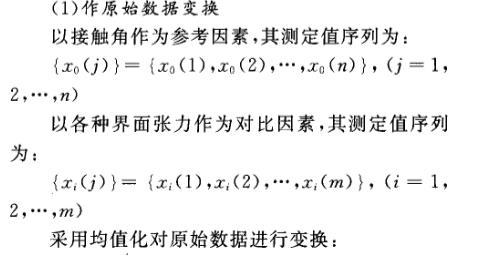 灰色關(guān)聯(lián)分析是通過對統(tǒng)計序列幾何關(guān)系的比較來分清系統(tǒng)中多因素間的關(guān)聯(lián)程度,序列曲線的幾何形態(tài)越接近,則它們之間的關(guān)聯(lián)度越大。油水、水固、油固界面張力對接觸角影響程度的灰色關(guān)聯(lián)分析步驟如下。