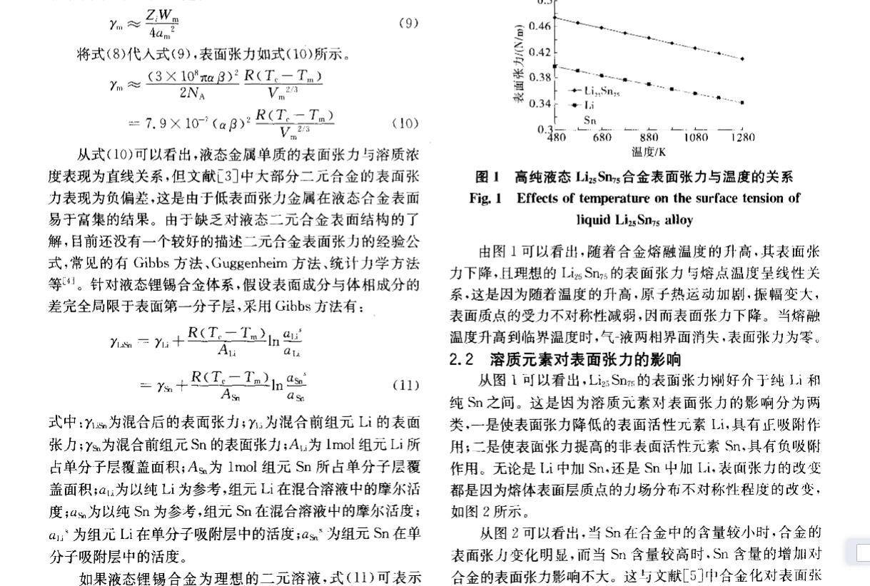 由圖l可以看出,隨著合金熔融溫度的升高,其表面張力下降,且理想的Li Sn;的表面張力與熔點(diǎn)溫度呈線性關(guān)系,這是因?yàn)殡S著溫度的升高,原子熱運(yùn)動(dòng)加劇,振幅變大,表面質(zhì)點(diǎn)的受力不對(duì)稱性減弱,因而表面張力下降。當(dāng)熔融溫度升高到臨界溫度時(shí),氣一液兩相界面消失,表面張力為零。