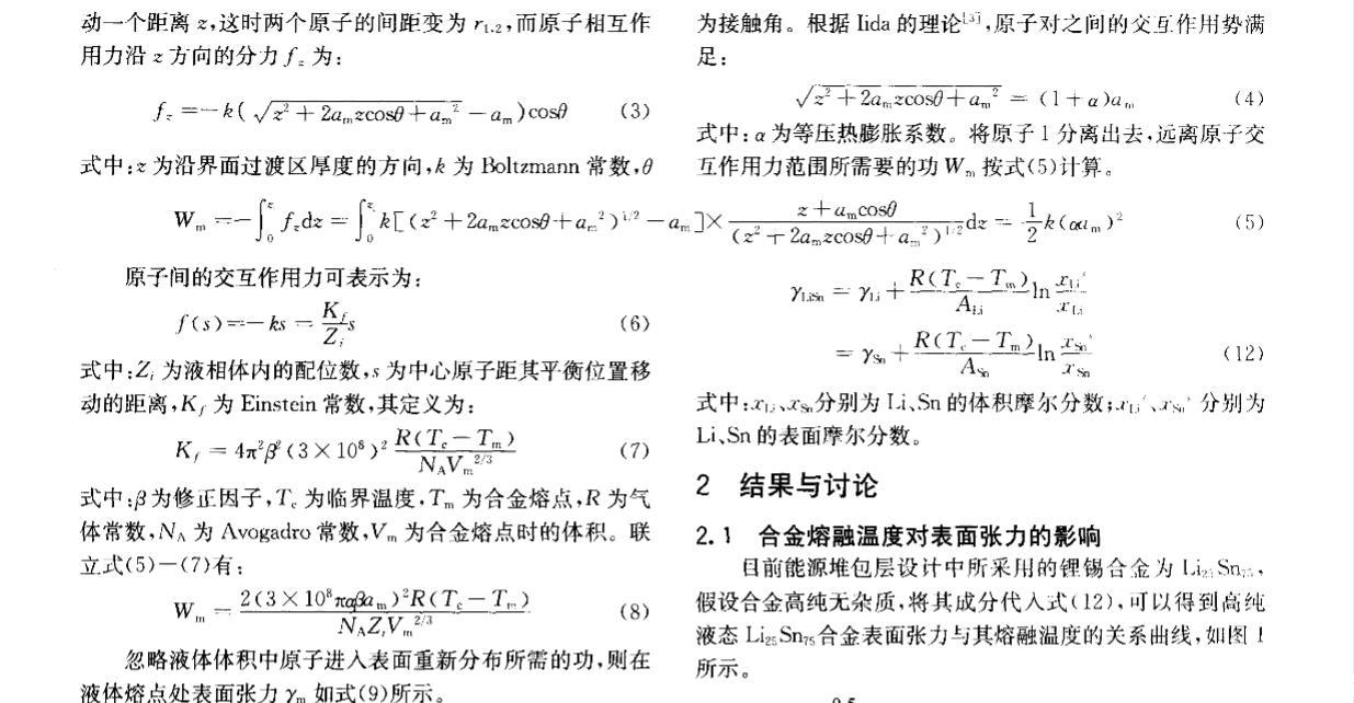 核能是公認(rèn)現(xiàn)實(shí)可行的、可大規(guī)模替代常規(guī)能源的清潔能源。聚變堆或聚變_裂變混合堆液態(tài)金屬包層因其固有特性和優(yōu)勢(shì),在國(guó)際上被普遍認(rèn)為是未來(lái)電站最具發(fā)展?jié)摿Φ陌鼘釉O(shè)計(jì)方案之一。作為包層氚增殖劑和冷卻劑的鋰錫合金與鋰鉛合金一樣,具有廣闊的發(fā)展前景,其制備、純化、質(zhì)量輸運(yùn)等工藝難題正逐步得到重視。液態(tài)金屬的表面張力不僅是認(rèn)識(shí)和理解冶煉過(guò)程最基本的物理量之一,而且是氣體吸收、氣泡形核、雜質(zhì)生長(zhǎng)等界面現(xiàn)象的控制因素。目前對(duì)液態(tài)金屬表面張力的研究多集中于金屬單質(zhì),合金的表面或界面行為在理論或?qū)嶒?yàn)上都相當(dāng)不足,主要是由于精確確定表面張力十分困難[2]。針對(duì)液態(tài)鋰錫合金這種新型的核材料,從基礎(chǔ)研究方面看,目前還沒(méi)有一種實(shí)驗(yàn)方法能確定液體界面的結(jié)構(gòu),即兩個(gè)相之間過(guò)渡區(qū)域的結(jié)構(gòu),因此需要有一些假設(shè)或模型來(lái)滿足表面張力理論的研究。