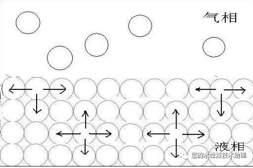 表面張力是因液體內(nèi)部分子間的內(nèi)聚力而產(chǎn)生的,表面分子由于受力不均衡而受到向內(nèi)的作用力,與其它作用力形成平衡。原理示意如下: