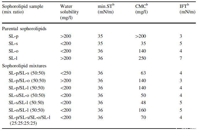 表3.由棉鈴蟲從棕櫚酸(SL-p)、硬脂酸(SL-s)、油酸(SL-o)、亞油酸(SL-l)及其混合物中生產(chǎn)的槐脂的物理性質(zhì)a