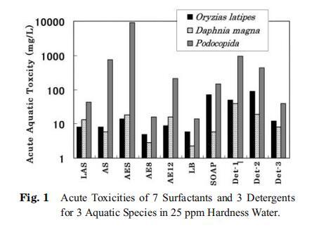 使用3種測試生物:米齊亞屬latipes、大型水蚤(daphnia magna)和podocopida,測定了7種表面活性劑和3種商用洗滌劑的急性毒性。 結果如圖1所示。 在所有情況下,足爪螨的EC50和/或LC50均高于寬脊稻和大型水蚤。 肥皂和LB對稻瘟病菌的毒力值高于對大型水蚤的毒力值,而其他5種表面活性劑對稻瘟病菌和大型水蚤的毒力值幾乎相等。 表面活性劑可分為3類; 低毒組(AES、SOAP和AE12)、中毒組(LAS和AS)和高毒組(AE8和LB)。