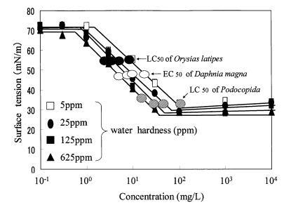 圖8水硬度對肥皂表面張力曲線的影響以及3種水生物種的有毒表面張力值。