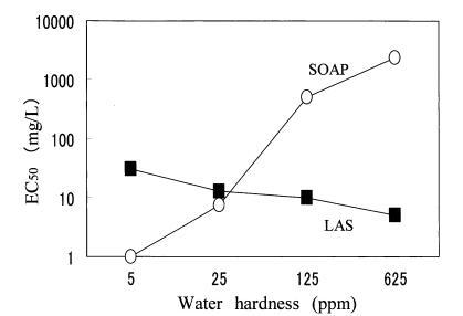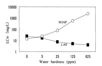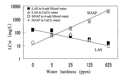 在預試驗中,大型水蚤在4鹽混合溶液中存活,但在CaCl2?H2O溶液或蒸餾水中不能存活。 另一方面,角鯊在所有3種水中都能存活。 因此,使用podocopida研究了水硬度成分對LAS和肥皂毒性的影響。 如圖3所示,CaCl2?H2O溶液和4-鹽混合溶液的毒性值沒有差異。 肥皂的毒性隨水硬度的增加而降低,LAS的毒性隨水硬度的增加而增加。