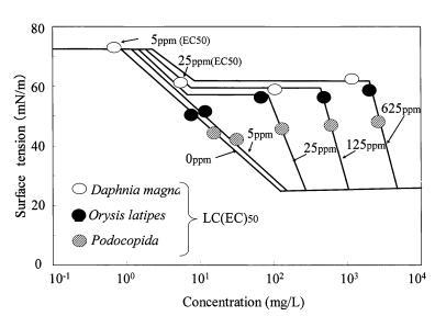 肥皂的毒性值繪制在圖8的表面張力曲線上。 可以確定,寬脊稻和波多西稻的γtox值分別約為55 mN/m和40-45 mN/m。 然而,大型水蚤的γtox值有兩個范圍:硬度為5ppm時為73mn/m,硬度為25-625ppm時約為60mn/m。