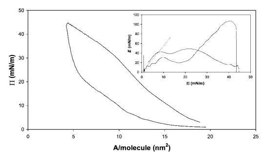 藜蘆皂甙。奎拉葉皂苷的壓縮曲線如圖6所示。該皂甙在拐點(diǎn)處顯示出非常高的表面壓力,最大表面壓力為45 mN m-1。此外,皂甙表現(xiàn)出很寬的遲滯回線。從E–P曲線推斷出斜率為4.3,觀察到E中出現(xiàn)2個(gè)平滑的峰,這可能表明界面中存在相變,從皂甙的相對(duì)拉長(zhǎng)的疏水區(qū)域判斷。27當(dāng)屏障方向逆轉(zhuǎn)時(shí),觀察到E中存在較大的超調(diào),表明膜破裂,類似于HFBII。