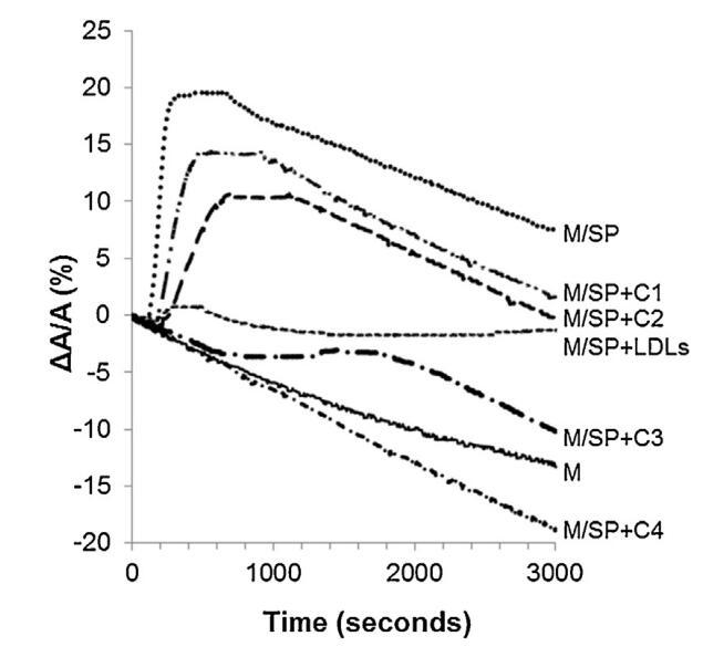 當(dāng)LDL與牛精漿以重量-蛋白質(zhì)比10:1(BSP:LDL)混合并注射到單層下方時(shí),隨時(shí)間記錄的單層分子面積幾乎沒(méi)有變化(曲線M/SP+LDL,圖5)。400秒左右出現(xiàn)一個(gè)肩部,顯示BSP蛋白的弱吸附(該肩部代表M/SP的5%,上圖曲線)。然后,分子面積的變化在1000秒后減小并趨于穩(wěn)定。其下降幅度不如M和M/SP曲線的變化幅度大,表明LDL組分吸附,與它們?cè)诮缑嫔系母邤U(kuò)散能力一致(曲線M/LDL,圖4)。因此,由于低密度脂蛋白(LDL),SP中BSP蛋白在界面上的吸附大大減少,BSP/LDL的比率非常接近最佳值,以完全防止BSP蛋白影響單層。根據(jù)低密度脂蛋白的組成,注射磷脂酰膽堿的量估計(jì)為4.61毫克[33]。因此,向4.61 mg低密度脂蛋白磷脂酰膽堿注射26.6 mg精漿蛋白質(zhì),即0.17 mg磷脂酰膽堿注射1 mg精漿蛋白質(zhì)。