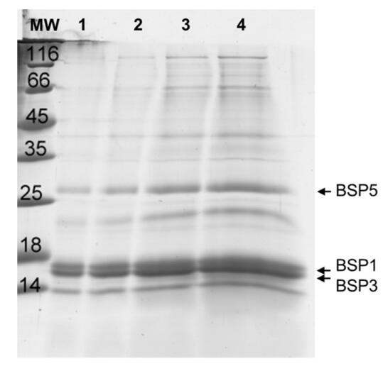 圖1。從牛射精中分離并以不同濃度沉積的精漿SDS-PAGE凝膠:lane 1:1μg;泳道2:2μg;泳道3:5μg和泳道4:10μg。