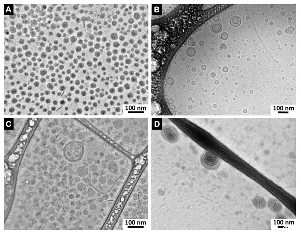 圖7。(A)低密度脂蛋白,(B)脂質(zhì)體,(C)低密度脂蛋白和精漿(精漿中的比例為0.17 mg PC/mg BSP蛋白質(zhì))和(D)脂質(zhì)體和精漿(精漿中的比例為0.16 mg PC脂質(zhì)體/mg BSP蛋白質(zhì))的冷凍電鏡圖像。