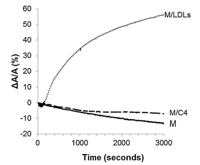 圖4。單層(M)所覆蓋的界面的相對(duì)表面積隨時(shí)間的變化,該單層(M)以25 mN/M的速度壓縮,并在不含任何額外分子(-)的緩沖液上形成,(…)LDL(4.6 mg PC)和(-)脂質(zhì)體C4(含4.8 mg PC)。空氣-緩沖界面處的溫度為34℃。
